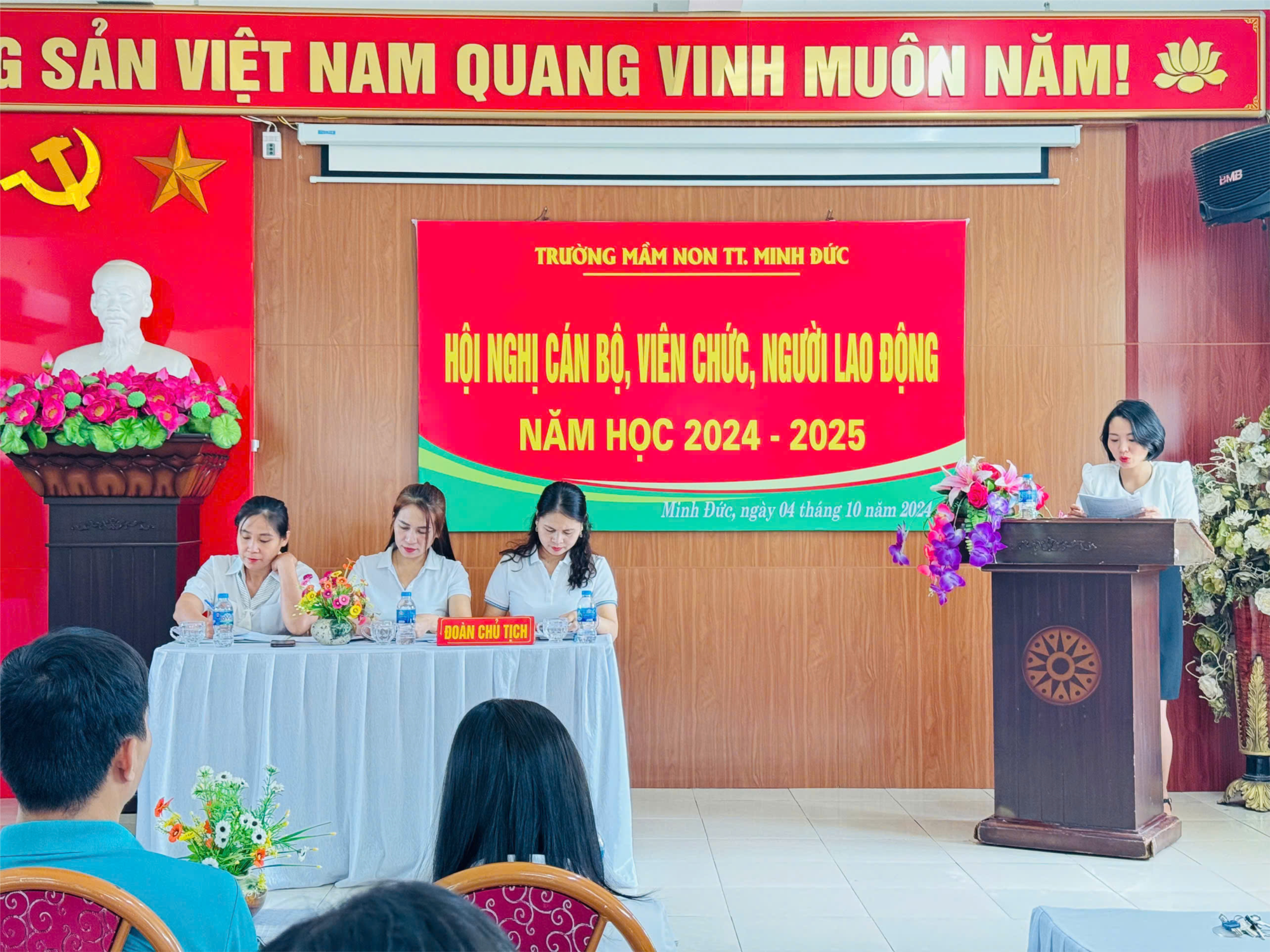 Sáng ngày 04/10/2024, Trường Mầm non Minh Đức long trọng tổ chức Hội nghị cán bộ, viên chức, người lao động năm học 2024 - 2025.