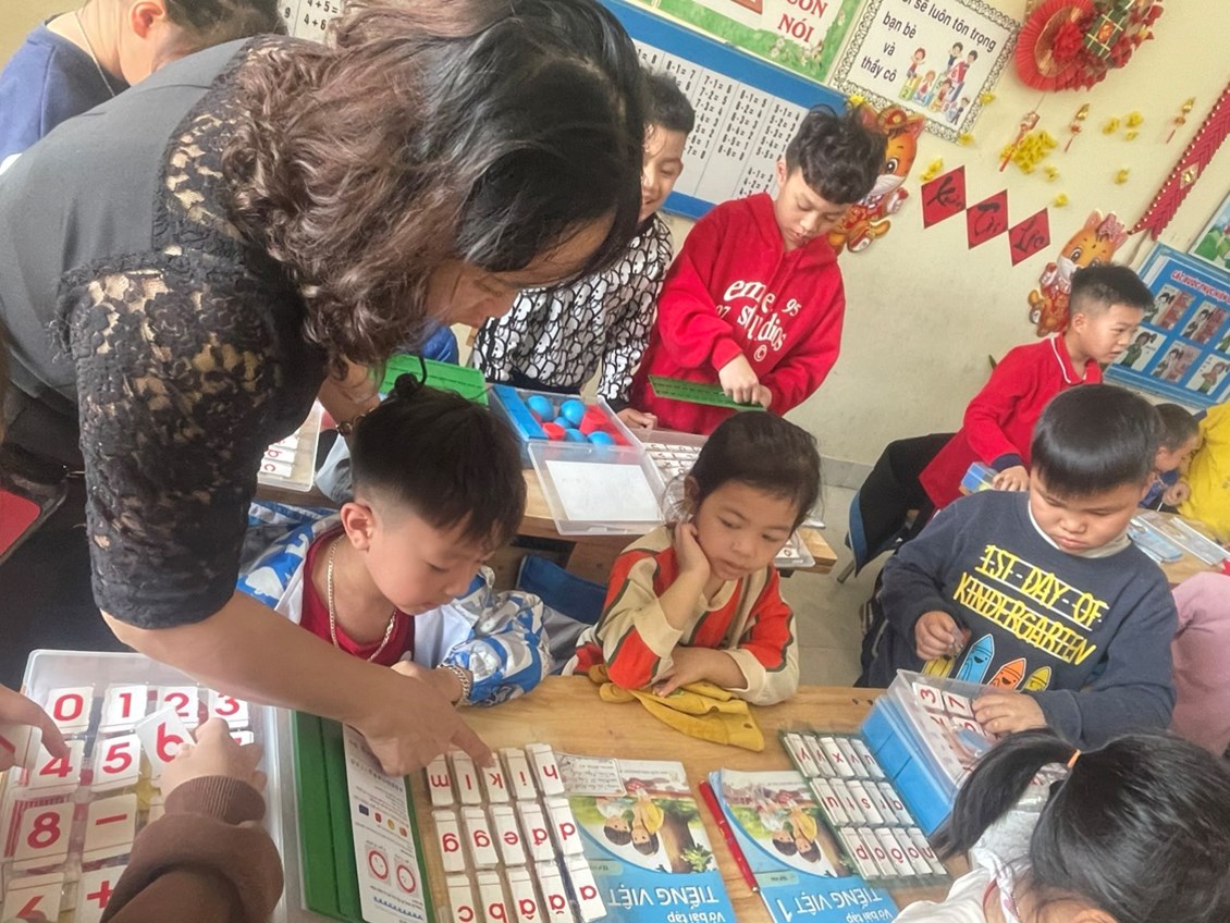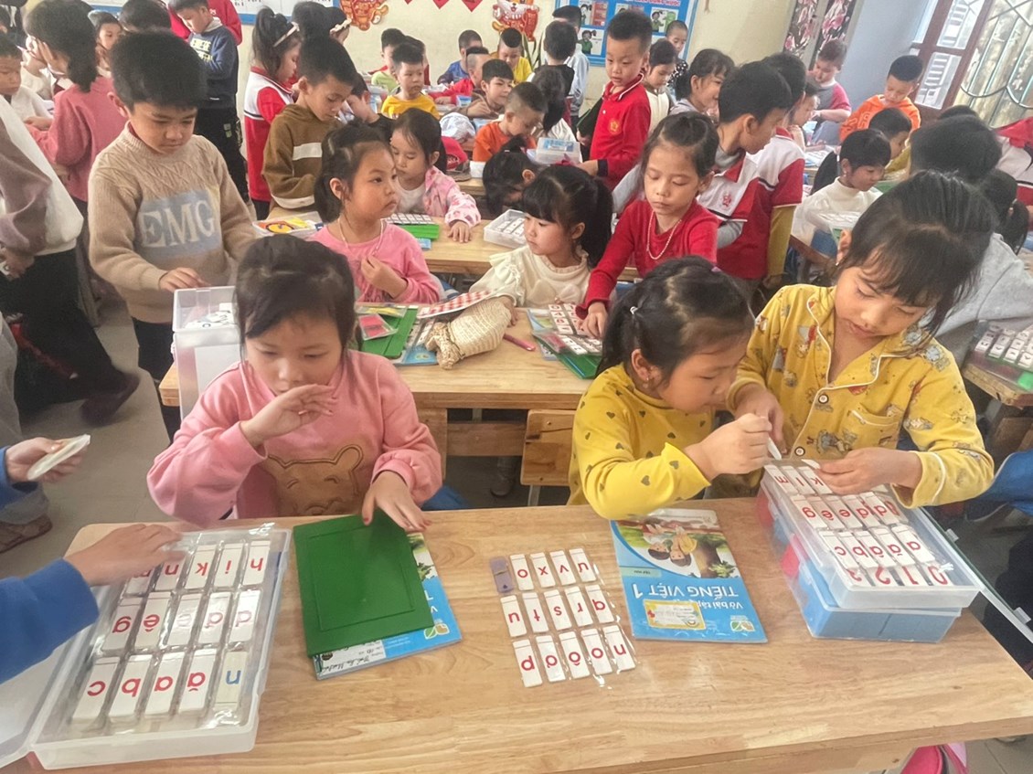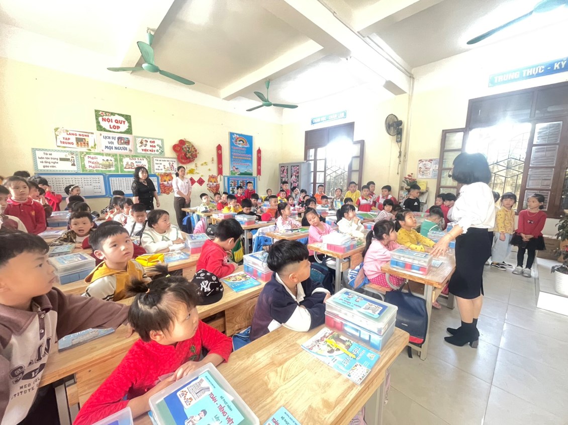 Các bé được trò chuyện với cô giáo lớp 1, được cô giáo giới thiệu về trường tiểu học, về lớp 1, về đồ dùng học tập và các hoạt động học tập ở trường tiểu học khác với ở trường mầm non như thế nào. Qua đó, giúp các bé có thêm hiểu biết về trường tiểu học và các hoạt động học tập của học sinh tiểu học. Các bé vào lớp học giao lưu, trò chuyện với các anh chị lớp 1 và được ngồi vào bàn học, được làm quen với những đồ dùng học tập vô cùng mới lạ và hấp dẫn. Sau đó, các bé còn được các cô dẫn đi tham quan dãy phòng học và các phòng chức năng của nhà trường. Các em được đi tìm hiểu xung quanh nhà trường.