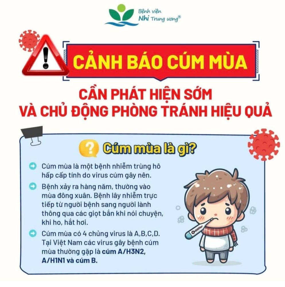Do vậy, cha mẹ cần nhận biết sớm các triệu chứng của cúm mùa để xử trí và đưa con đến bệnh viện thăm khám kịp thời, tránh các biến chứng nguy hiểm. Đặc biệt, cha mẹ nên cho trẻ tiêm vắc xin phòng bệnh để bảo vệ trẻ hiệu quả nhất trước tác nhân gây bệnh cúm mùa