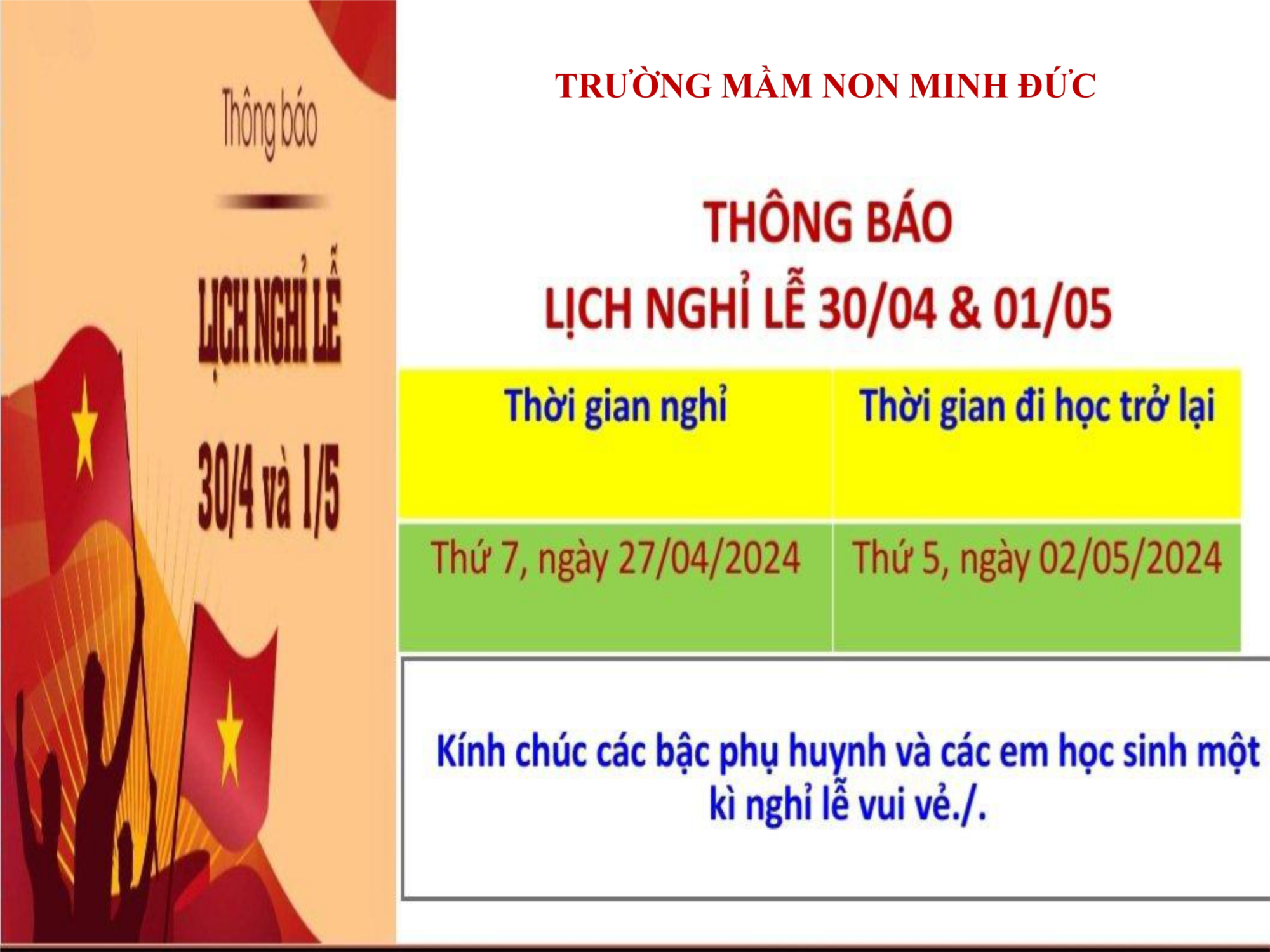 Trường mầm non Minh Đức thông báo lịch nghỉ lễ 30/4 và 1/5/2024